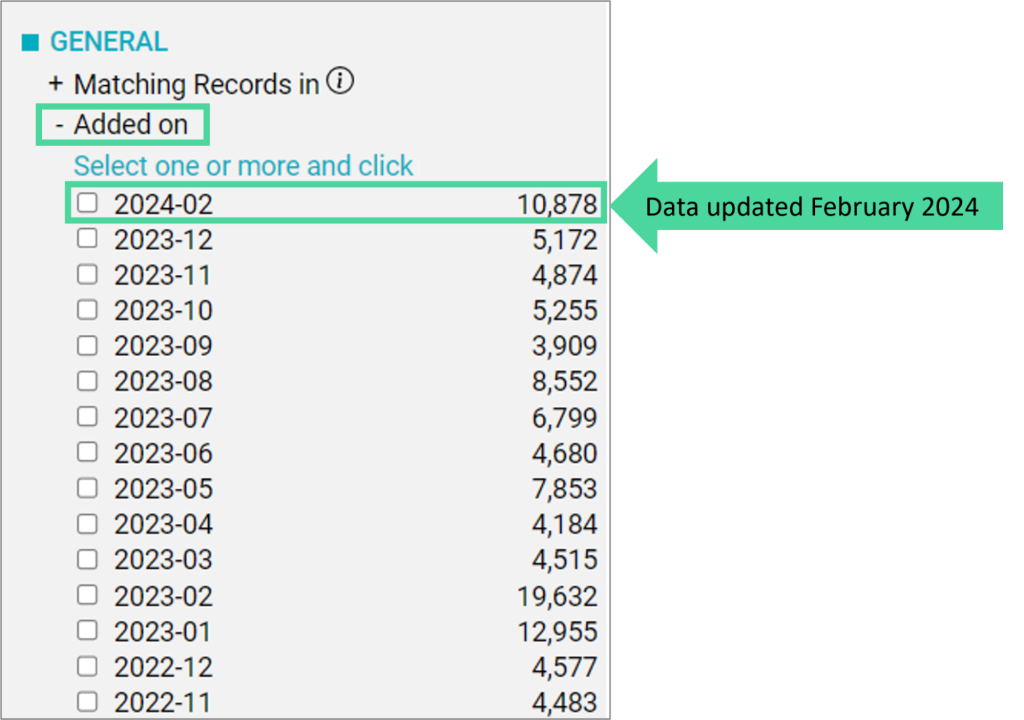 In the filter ‘Added on’ you can see and limit your search result to the year/month when the individual publication records were added to the database. This can be particularly useful if you want to see only newly added publications.